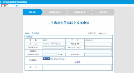 4.申请人按表格中的项目填写完毕且确认无误后提交(备注可添加文字介绍出售住房的补充信息)。